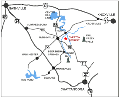Overton Retreat is located on Long Mountain in middle Tennessee, within 90 minutes of Nashville and Chattanooga. Excellent road access is available from these and many other cities.